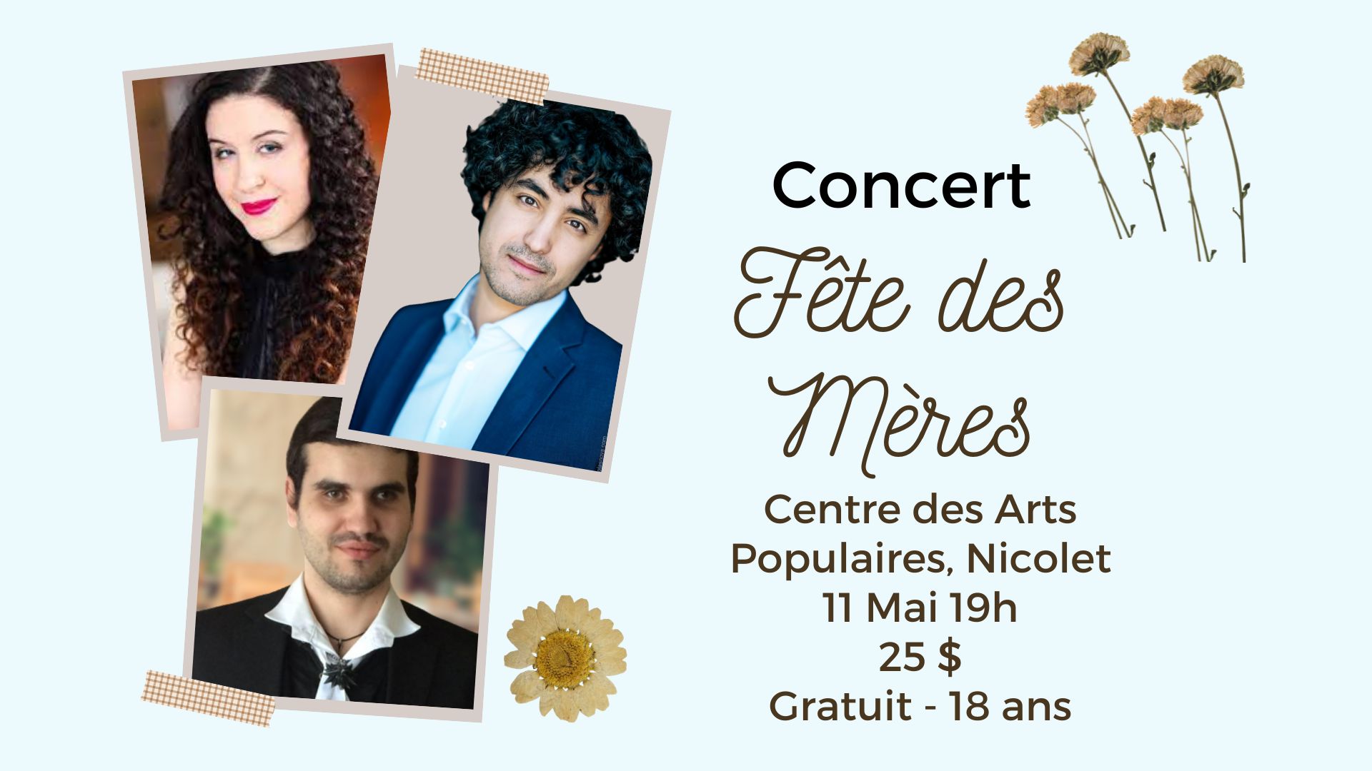 Le jeudi 11 mai à 19h, venez célébrer la Fête des Mères à la salle du Centre des Arts Populaires de Nicolet. Vous serez enchantés par le ténor Ismaël Billy, directement venu de France, ainsi que par le ténor Julian Frigon et la soprano Valérie Poisson, artistes de la diversité capacitaire. Nous vous offrirons un répertoire d’airs d’opéras francophones. Venez découvrir notre saison 2023-2024 !